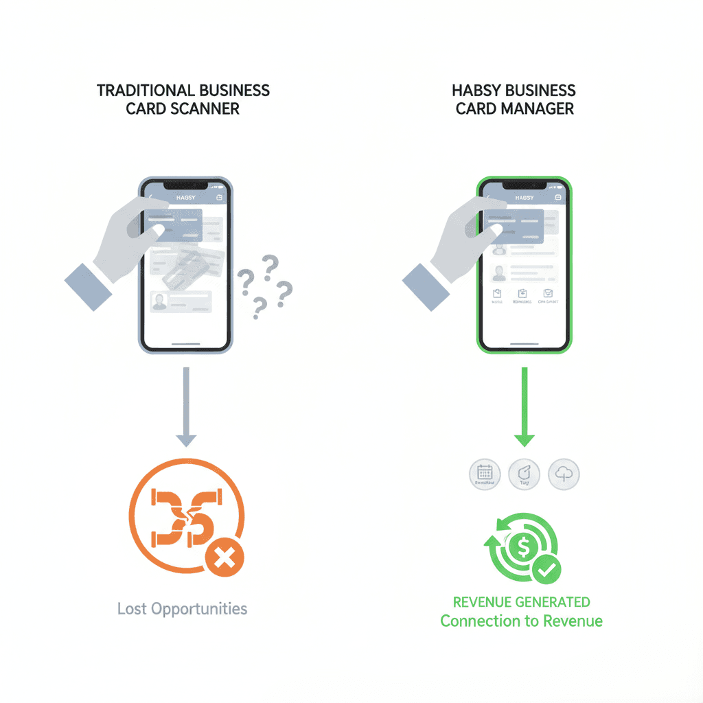 A: A business card scanner digitizes contact information from a physical card. A business card manager like Habsy goes further by organizing contacts, capturing conversation context, and supporting follow-up actions that turn meetings into real opportunities.